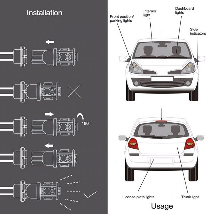 • Fitting: Side/Indicator/Dash Bulbs/Wedge Bulbs/Dashboard Lights/Home Lighting