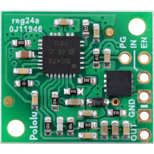 This small synchronous switching step-down (or buck) regulator takes an input voltage of up to 50 V and efficiently reduces it to 5 V. The board measures only 0.7″ × 0.8″ yet delivers typical maximum continuous output currents between 2.5 A and 4 A, depending on the input voltage, which makes it well suited for powering moderate loads like sensors or small motors. An optional enable input can be used to put the regulator in a low-power state with a current draw of 10 µA to 20 µA per volt on VIN. The regulator also features reverse voltage protection and a power-good output that indicates when the regulator cannot adequately maintain the output voltage. The pins have a 0.1″ spacing, making this board compatible with standard solderless breadboards and perfboards.